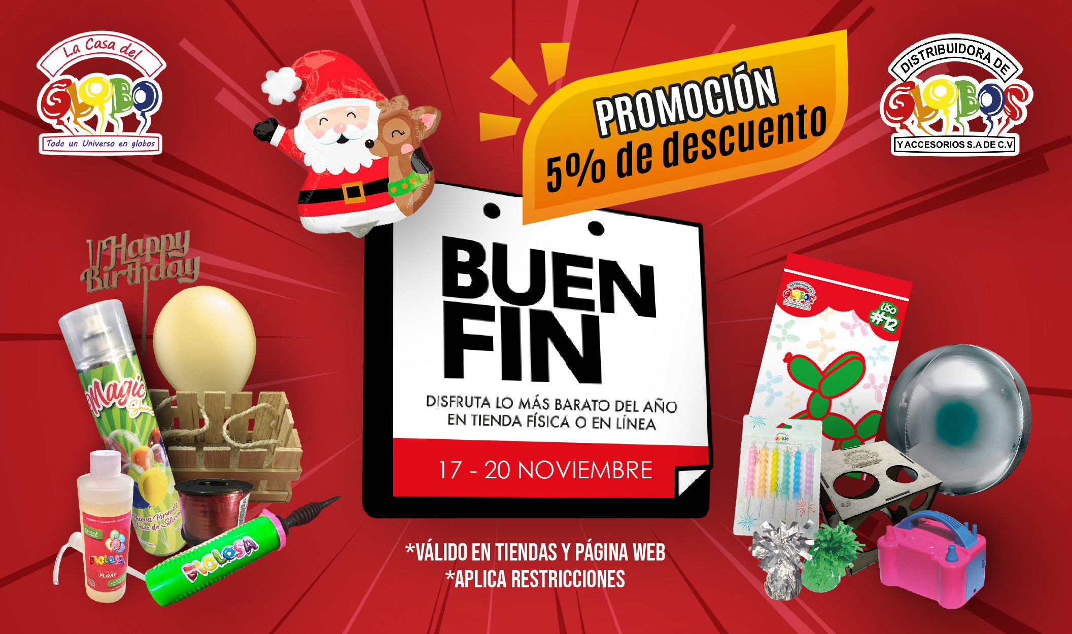 La utilización de estos enlaces, contenidos, servicios o funciones, tiene por objeto mejorar la experiencia del USUARIO al hacer uso del SITIO WEB, sin que pueda considerarse una sugerencia, recomendación o invitación para hacer uso de sitios externos. Distribuidora de Globos y Accesorios SA de CV en ningún caso revisará o controlará el contenido de los sitios externos, de igual forma, no hace propios los productos, servicios, contenidos, y cualquier otro material existente en los referidos sitios enlazados; por lo cual, tampoco se garantizará la disponibilidad, exactitud, veracidad, validez o legalidad de los sitios externos a los que se pueda tener acceso a través del SITIO WEB. Así mismo, el TITULAR no asume ninguna responsabilidad por los daños y perjuicios que pudieran producirse por el acceso o uso, de los contenidos, productos o servicios disponibles en los sitios web no gestionados por Distribuidora de Globos y Accesorios SA de CV a los que se pueda acceder mediante el SITIO WEB.